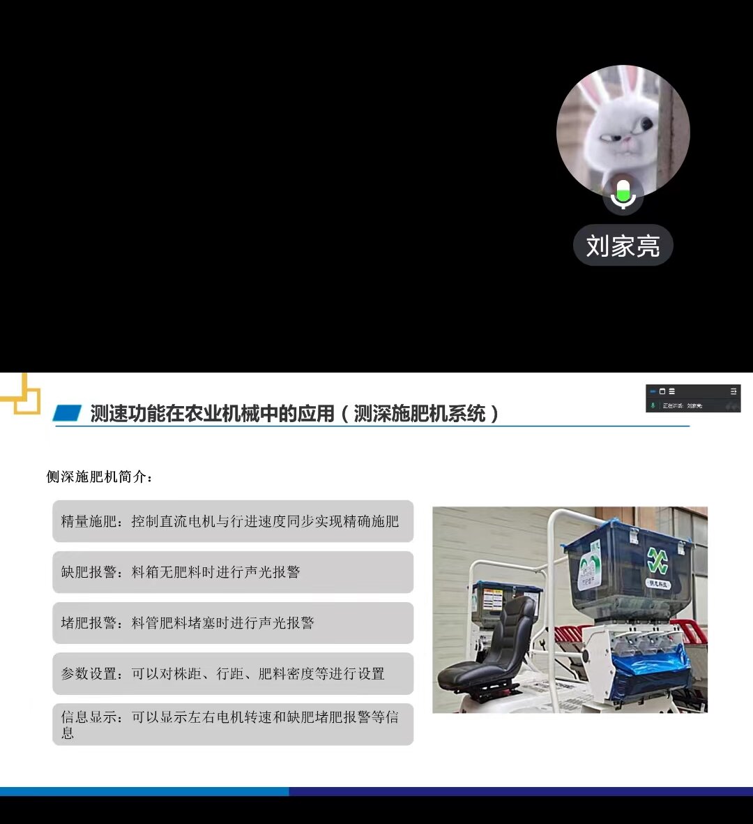 刘家亮高级工程师主要介绍了北斗定位系统,结合以往开发的组合仪表、精量施肥机控制系统、插秧机自动驾驶系统项目案例说明了北斗定位系统定位功能、测速功能、RTK高精度定位功能在农业机械中的应用。全体师生对北斗导航系统在农业机械领域的应用产生了浓厚的兴趣,李国昉老师在会上与刘家亮高级工程师进行了探讨和交流。