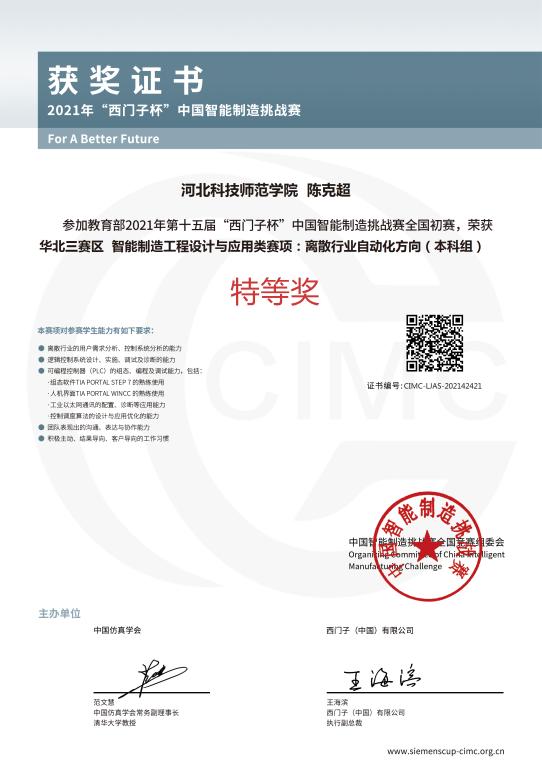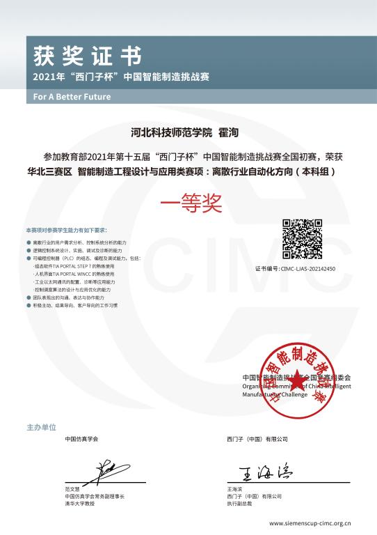近日,2021年第十五届“西门子杯”中国智能制造挑战赛华北三赛区比赛(河北赛区)在华北理工大学成功举办。公司球天下9名同学组成的3支代表队参加了此次大赛,分别获得离散行业自动化方向(本科组)团体特等奖、一等奖、二等奖。