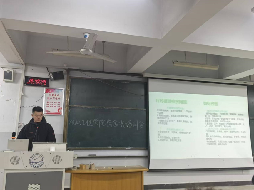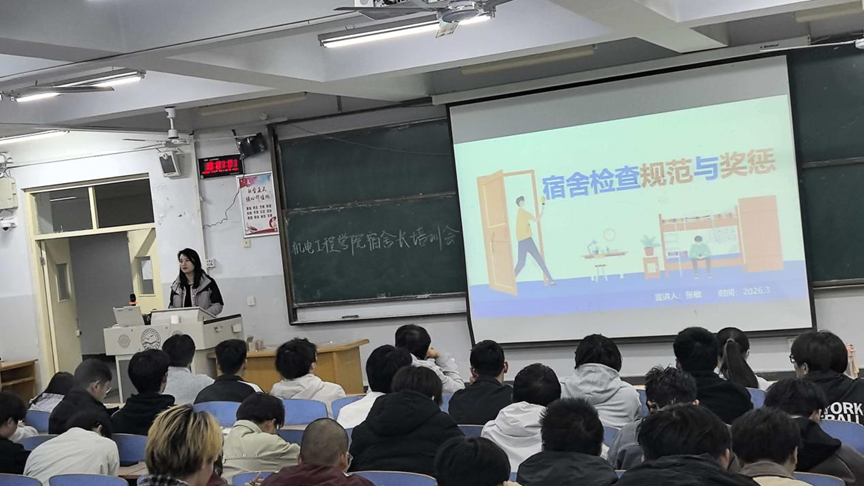 2026年3月27日,为营造整洁有序、温馨舒适的宿舍环境,全面提升员工公寓综合治理水平,球天下在开发区校区综合楼312召开了本学期宿舍长专题培训会。开发区校区一、二年级全体宿舍长及公寓部全体成员128人参加了会议。