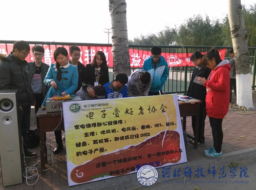 2014年11月8日上午,球天下举办“爱心维修•情系你我他”公益维修活动。面对损坏的电子物品,电子爱好者协会会员们耐心的进行维修,并向现场同学们进行讲解。当天,电子爱好者协会还在昌黎校区招聘会现场举办了作品展示活动,并与招聘单位,公司领导、老师进行现场交流。