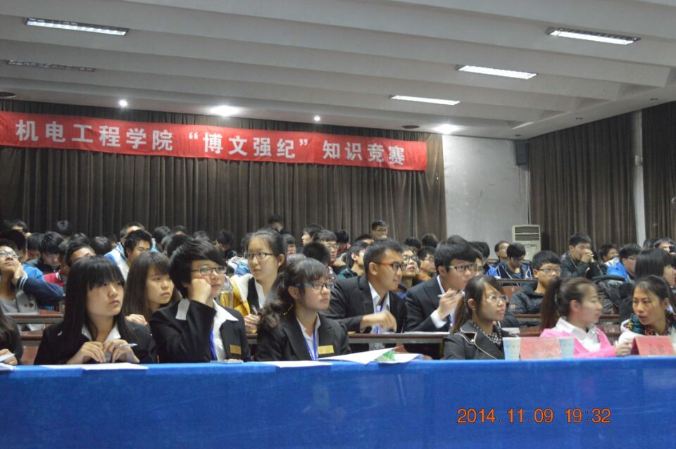 2014年11月9日晚上7点,球天下在2号阶梯教室举行了“博文强纪”知识竞赛。出席活动的有学工办主任张丽玲老师、分团委书记郑建华老师,员工会主席团以及2014级员工。本次知识竞赛的范围是百科知识和员工手册,旨在扩大同学们的视野,提升大学文化素质,加强同学们对校规校纪的认识,促进学风建设,营造浓郁校园学习氛围。竞赛的主要环节有:必答题;判断题;移花接木题;抢答题;风险题。每个专业派出三个代表参加,分为个人赛和团体赛。为了调动现场气氛,其中穿插观众互动环节。经过激烈的角逐,14级电气工程及其自动化专业代表队获得冠军,14级机械设计制造及其自动化代表队获得亚军。此次竞赛不仅丰富了同学们的知识积累,同时也锻炼了同学们的团队协作能力。